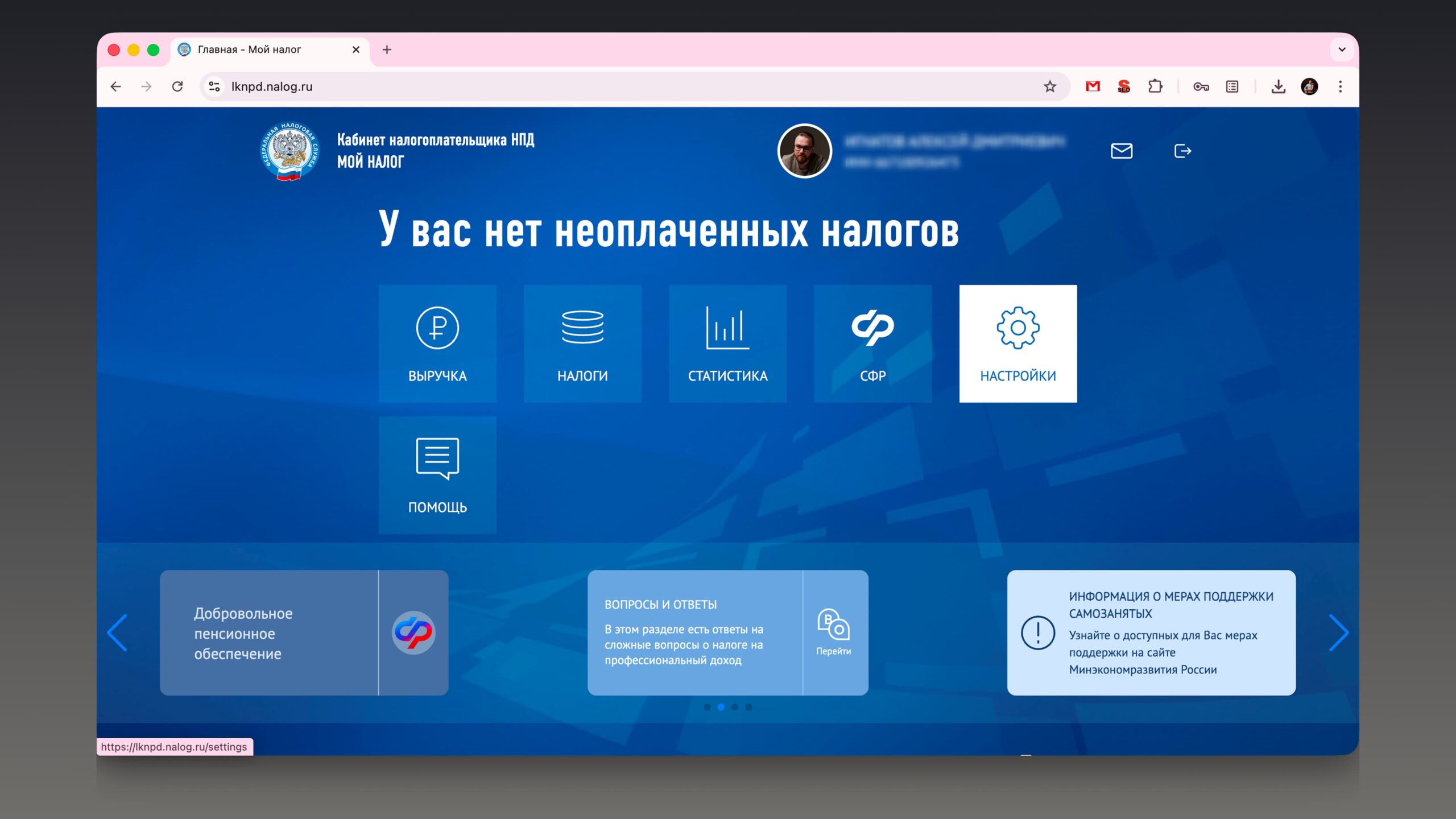 На сайте «Мой налог» перейдите в раздел «Настройки»