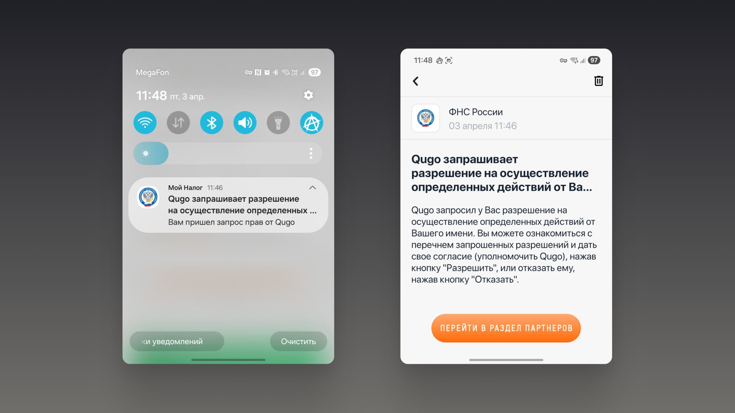 Если у вас установлено приложение «Мой налог», то придёт пуш-уведомление. Откройте его, чтобы дать Qugo необходимые разрешения.