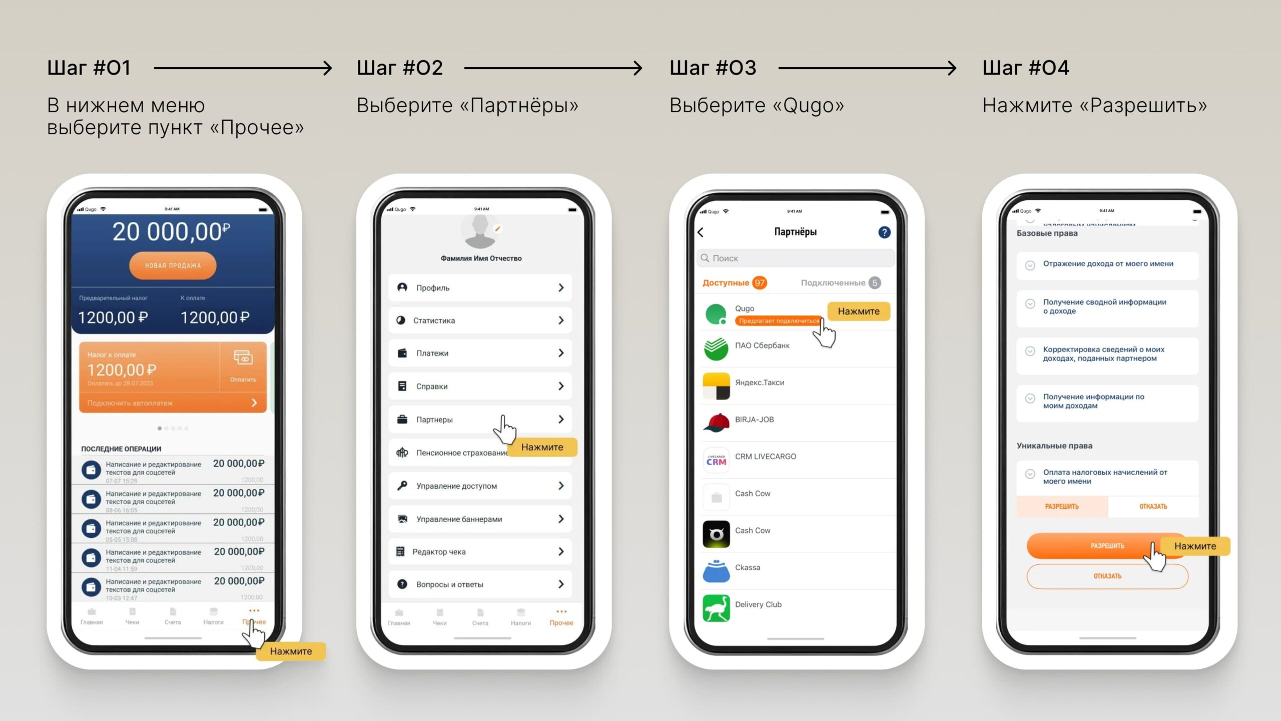 Откройте приложение «Мой налог». Перейдите на вкладку «Прочее» (иконка в правом нижнем углу). Перейдите в раздел «Партнёры». На вкладке «Доступные» долистайте до Qugo и нажмите на логотип. Изучите правила сервиса, нажмите на верхнюю кнопку «Разрешить», а после — на нижнюю. Так вы предоставите Кьюго право на уплату налогов.